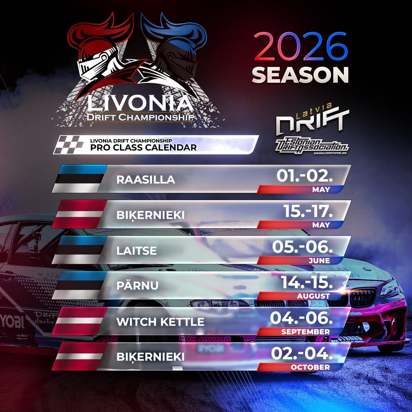 Organizatoriai paskelbė 2026-ųjų Livonia (bendrasis Latvijos ir Estijos) drifto čempionato datas ir vietas. Varžybos prasidės pirmąjį gegužės savaitgalį Estijoje, o finišuos spalio 2 – 4 dienomis Rygoje, Bikerniekų trasoje.