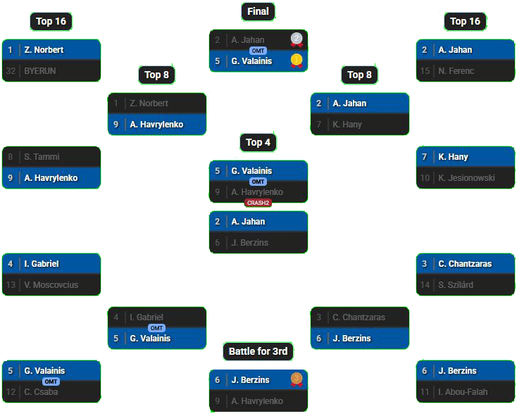 Sekmadienį Top 16 gavau OMT ir laimėjau prieš Cselőtei Csaba. Top 8 vėl OMT, prieš rumuną Imre Gabriel.